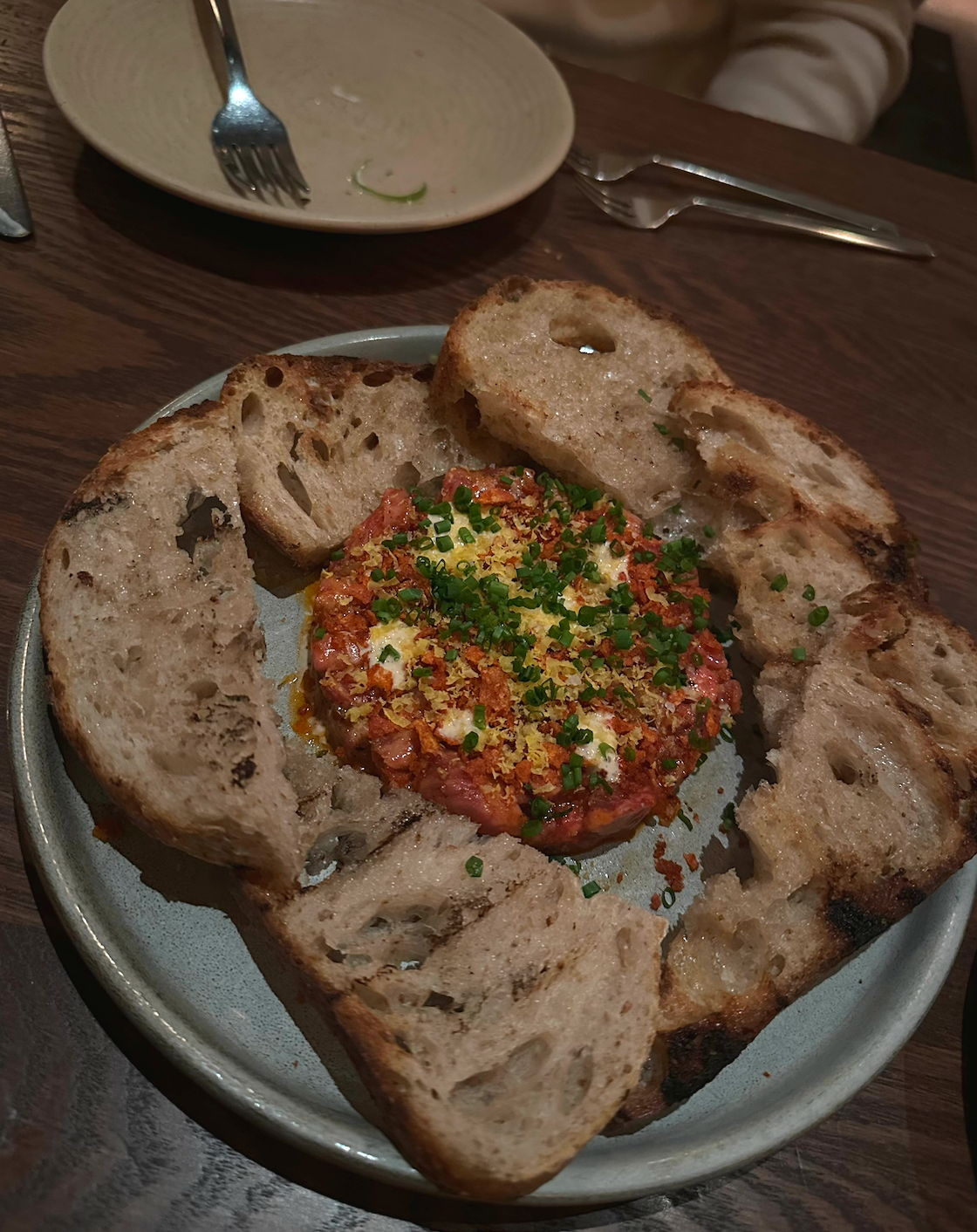Wagyu Beef Tartare: The first time we went to El Che, we ordered the beef tartare and loved it. It was creamy, flavorful, and served with sourdough bread that was fluffy on the inside and perfectly toasted on the outside. So naturally, we had high hopes for Brasero's version. Unfortunately, it fell short. We were expecting more flavor and the texture was firmer, chunkier pieces of steak rather than the smooth, creamy wagyu consistency we were expecting.