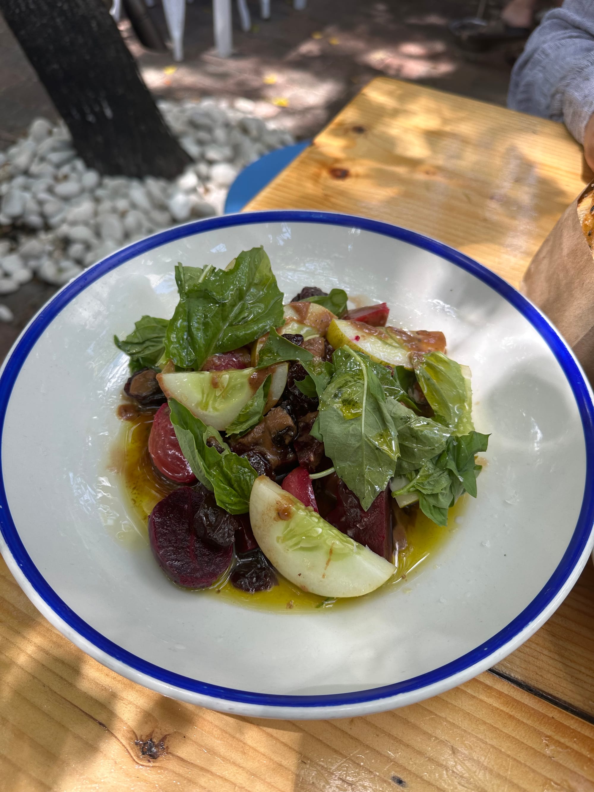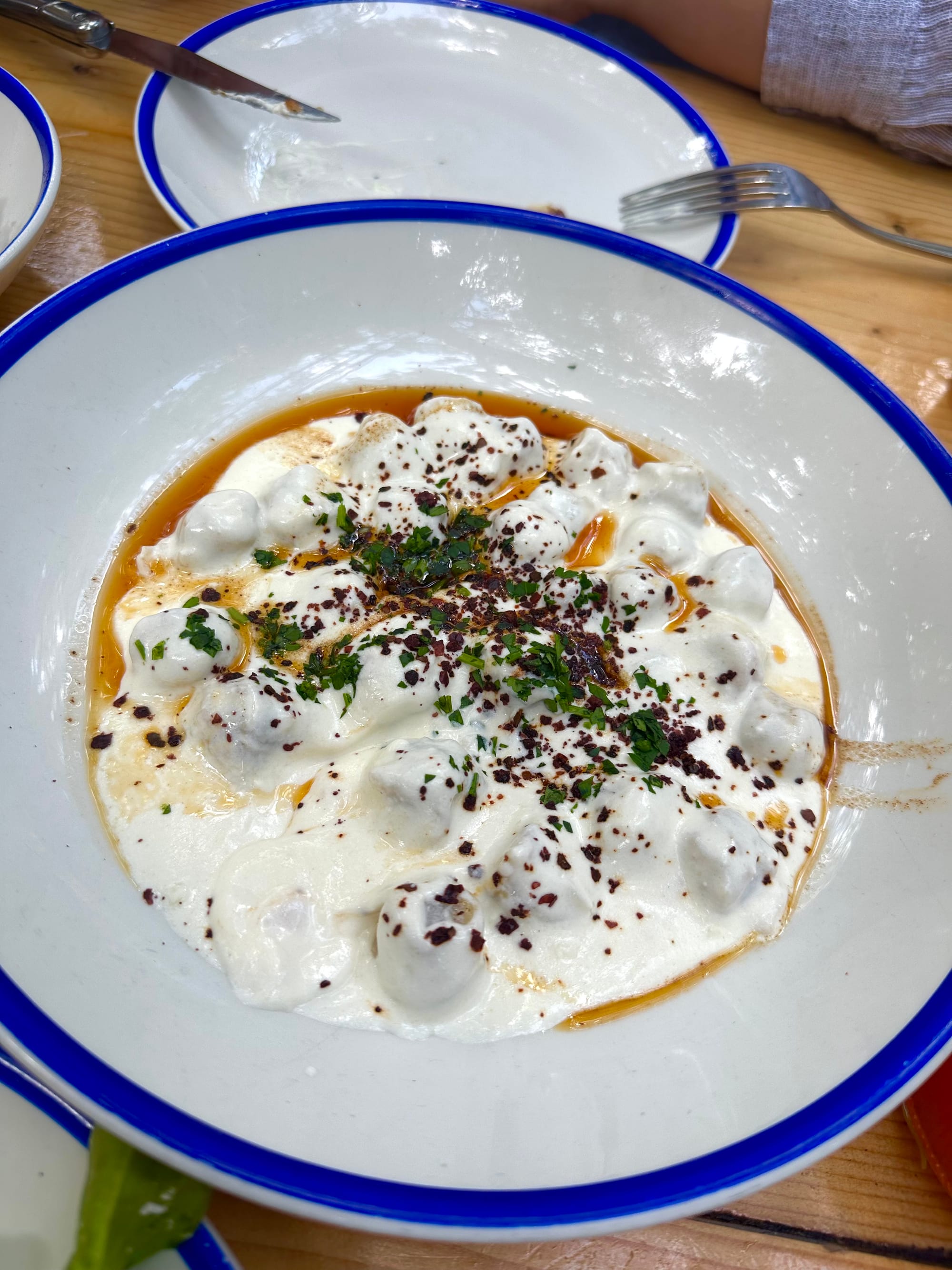 Mandolin - Design District: When I arrived at Mandolin for lunch, there was already a crowd gathered out front before the doors even opened. Thankfully, we had a reservation because the restaurant filled up almost immediately, and it’s easy to see why. The patio seating is beautiful, with a Mediterranean charm that reminded me a lot of Greece. We ordered one of their well-known dishes, the Manti Dumplings with beef, Aleppo pepper, and a garlic yogurt sauce. I thought it was really good, but I thought the yogurt sauce was a bit overpowering. A few dishes that really stood out to me were the Roasted Beets, the Saganaki, and the crispy Zucchini Chips—all flavorful, fresh, and worth going back for.