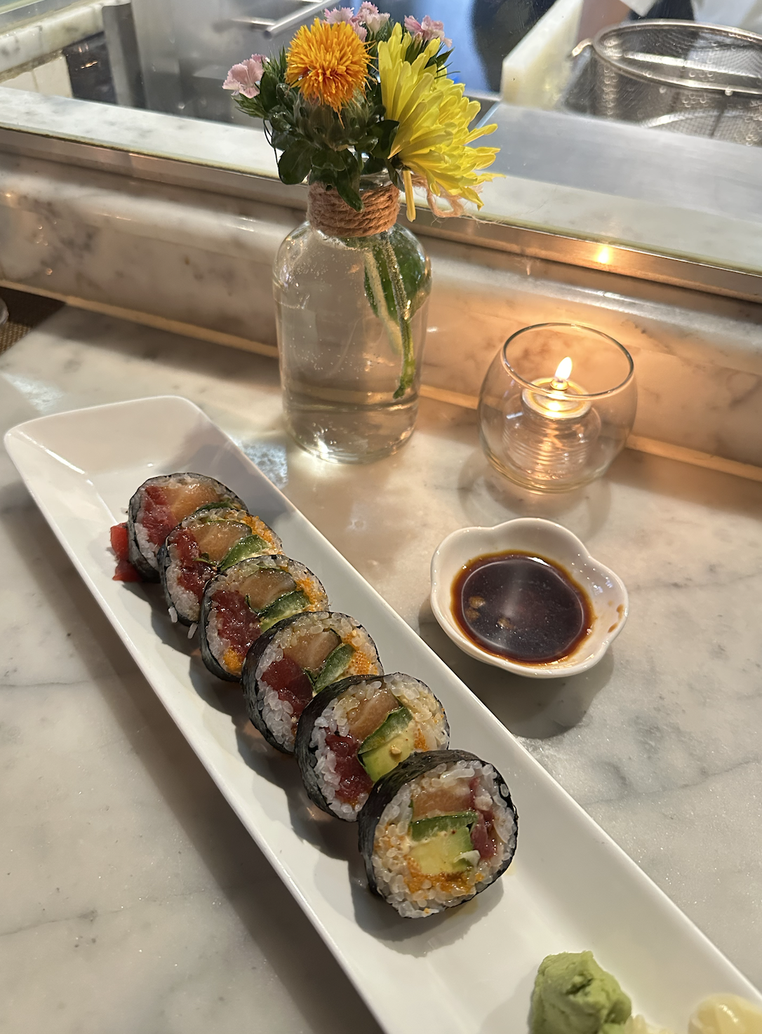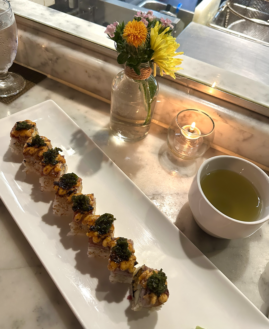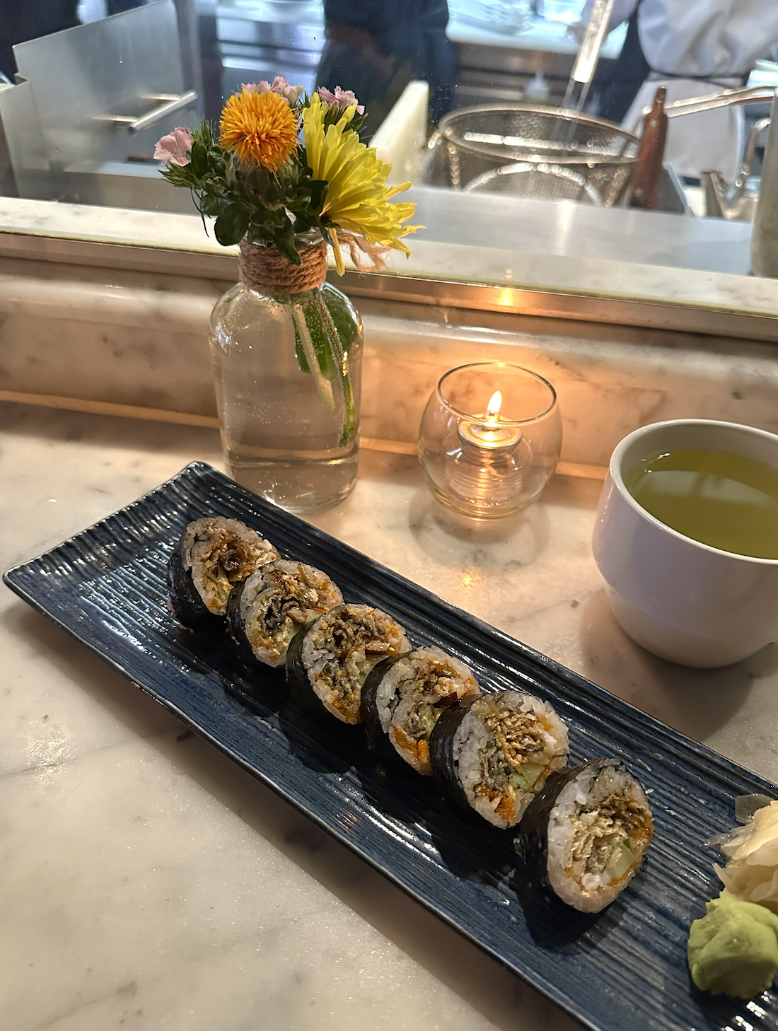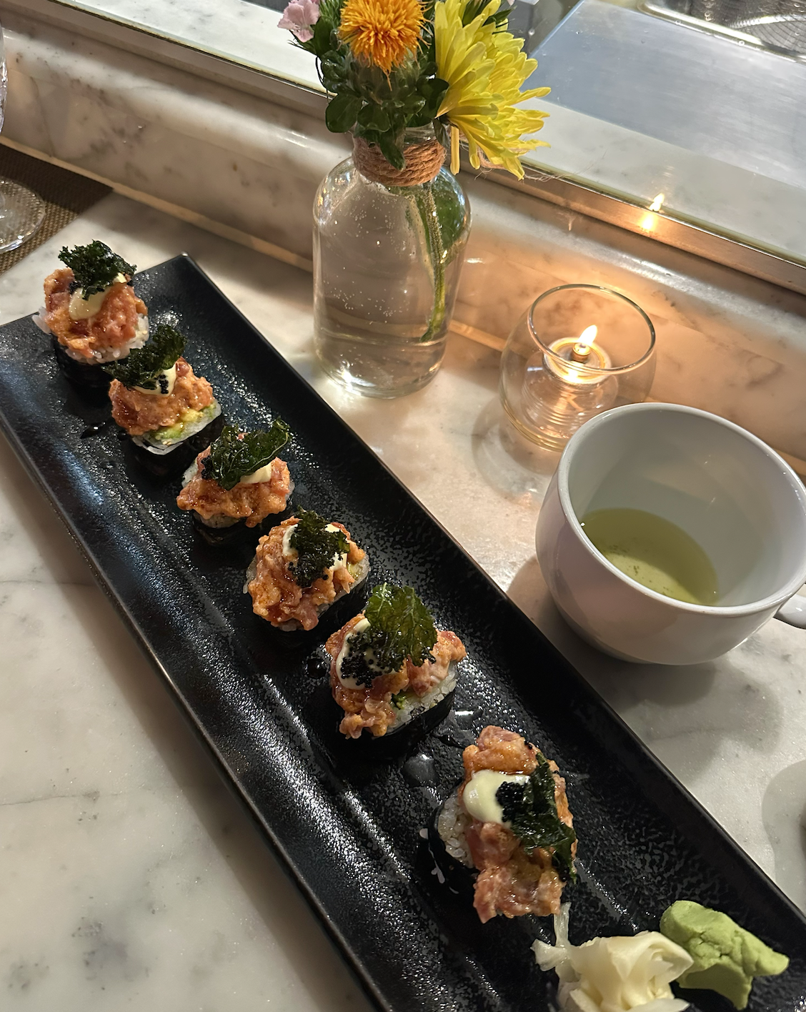 Flaming Tuna Maki: we were full after those first three rolls and ready for the check, but we were so interested in trying one more of their popular rolls on the menu, especially after how good everything was. So...we ordered it. I'm glad we did, because it ended up being our favorite. I love shrimp tempura and tuna, and the truffle dipped scallions were a great touch to this roll.