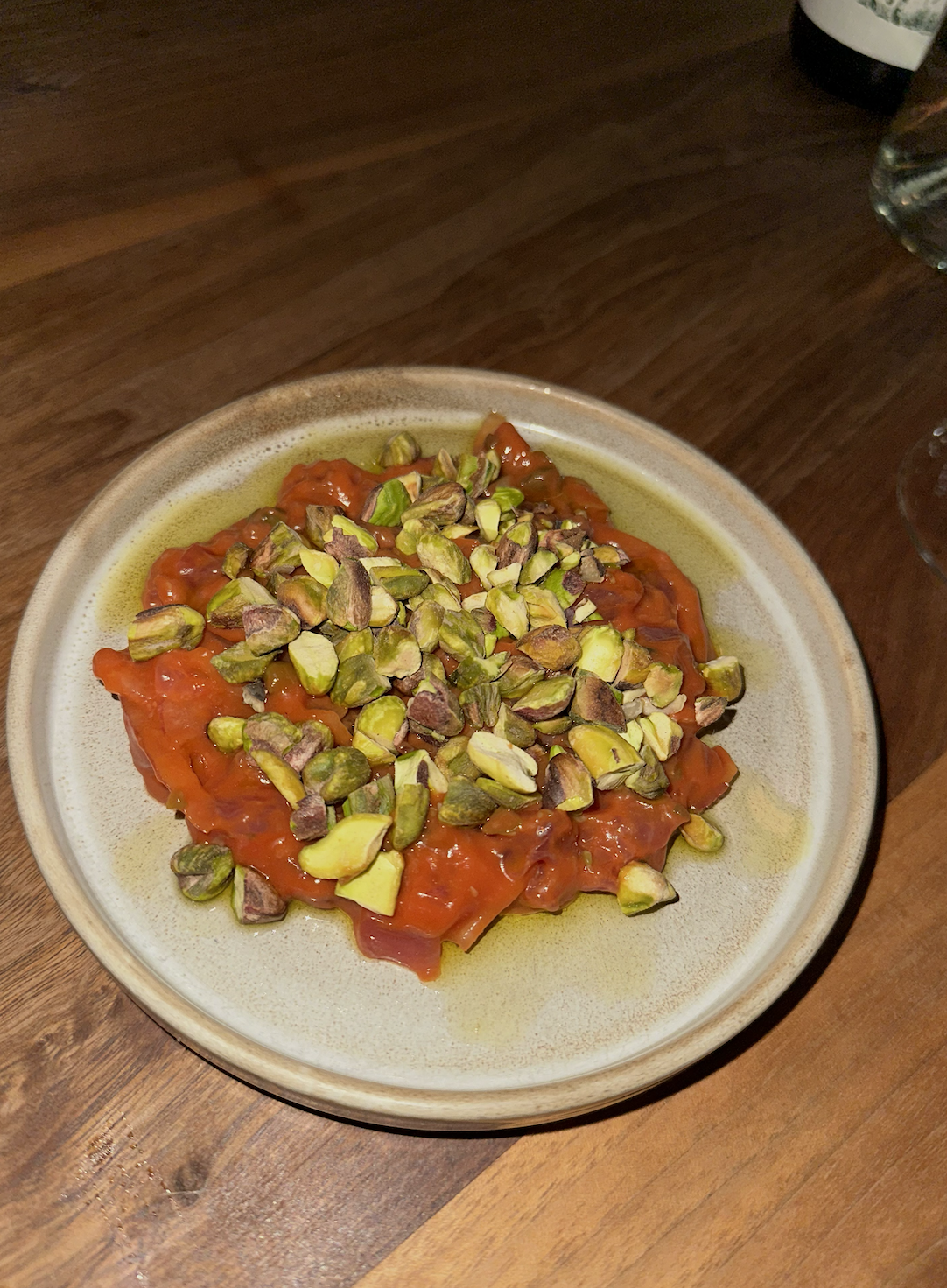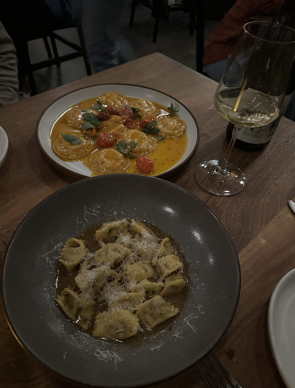 Penny Roma only serves wine, and we ordered a great Chenin Blend: 2022 Scions of Sinai, Chenin Blend, 'Granitas,' that paired really well with the dishes. My favorite dish we ordered was the Agnolotti dal Plin, a freshly made pasta dish, and the Albacore Tartare with calabrian chili and pistachios.