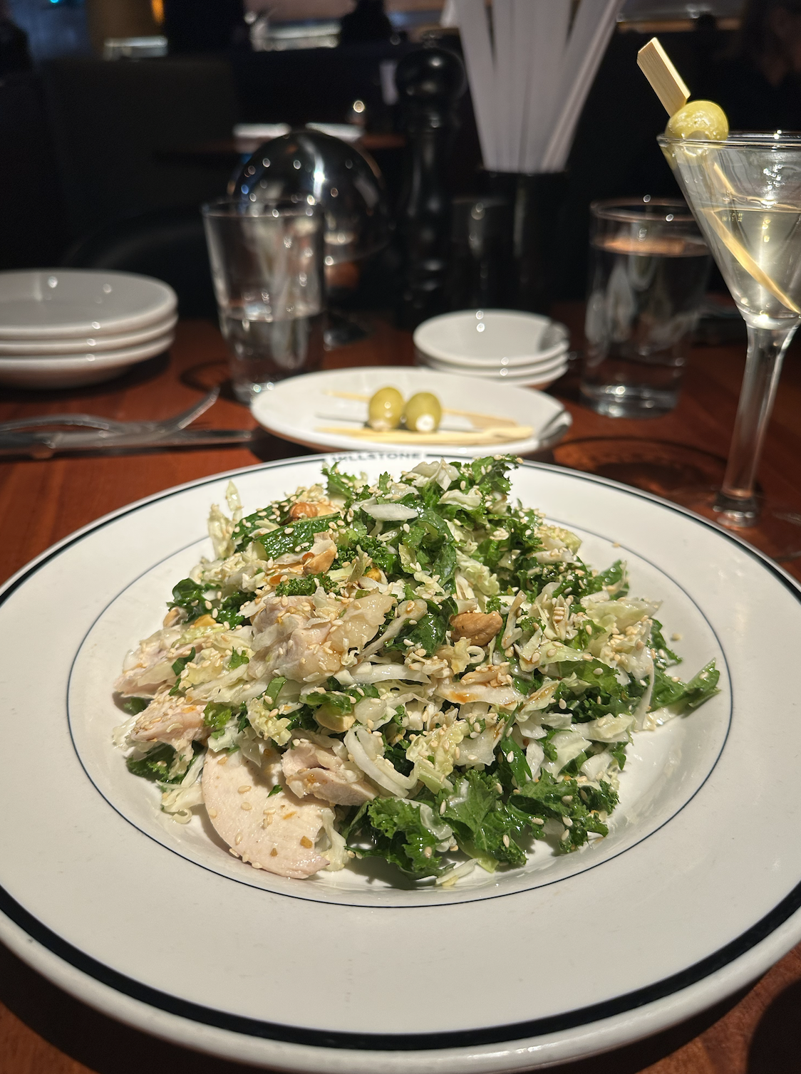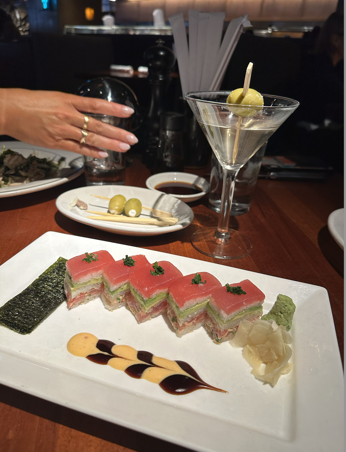 Hillstone - Flatiron/Gramercy: Hillstone is another restaurant I had been to in Miami years ago where I remember it being good, but nothing super memorable. However, I am still thinking about this meal. We sat there for probably 2.5-3 hours and practically had to be dragged out of there. The restaurant is cozy, dimly lit and has a great ambiance. The food was great, but the dirty martinis were a highlight for me. I didn’t realize this before, but Hillstone’s signature touch is always bringing you a fresh, ice-cold glass for your martini when it starts to warm up. This is such a small detail, but it makes the meal feel so elevated. Also...goat cheese stuffed olives with a dirty martini. Definitely game changer for me that I will be pairing with my dirty martinis moving forward. We ordered a few different dishes and split them all and I really liked everything we ordered. The Osaka Style Pressed Sushi was not like normal maki but still refreshing and good. The Kale and Chicken Salad was a great portion to split and good, too. My favorite two things we ordered were the French Dip and the Ding's Crispy Chicken Sandwich.