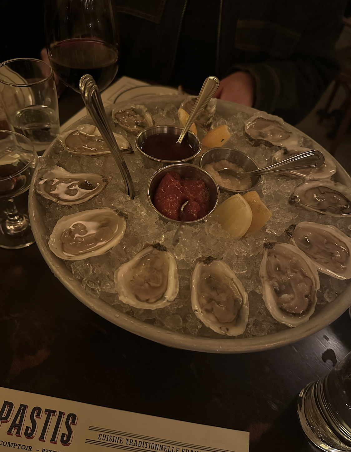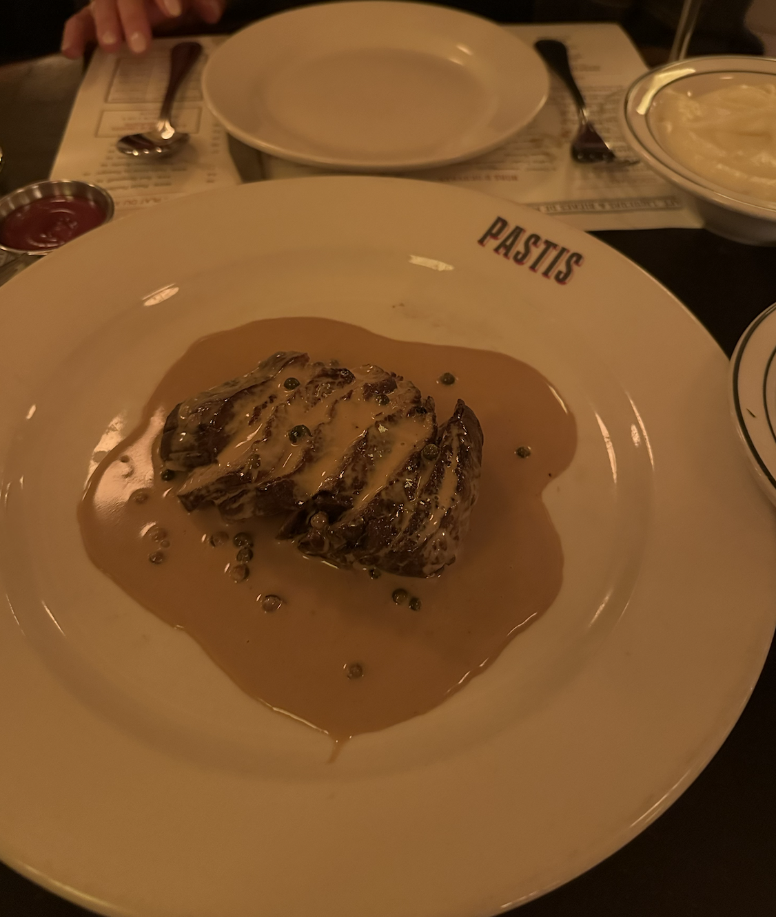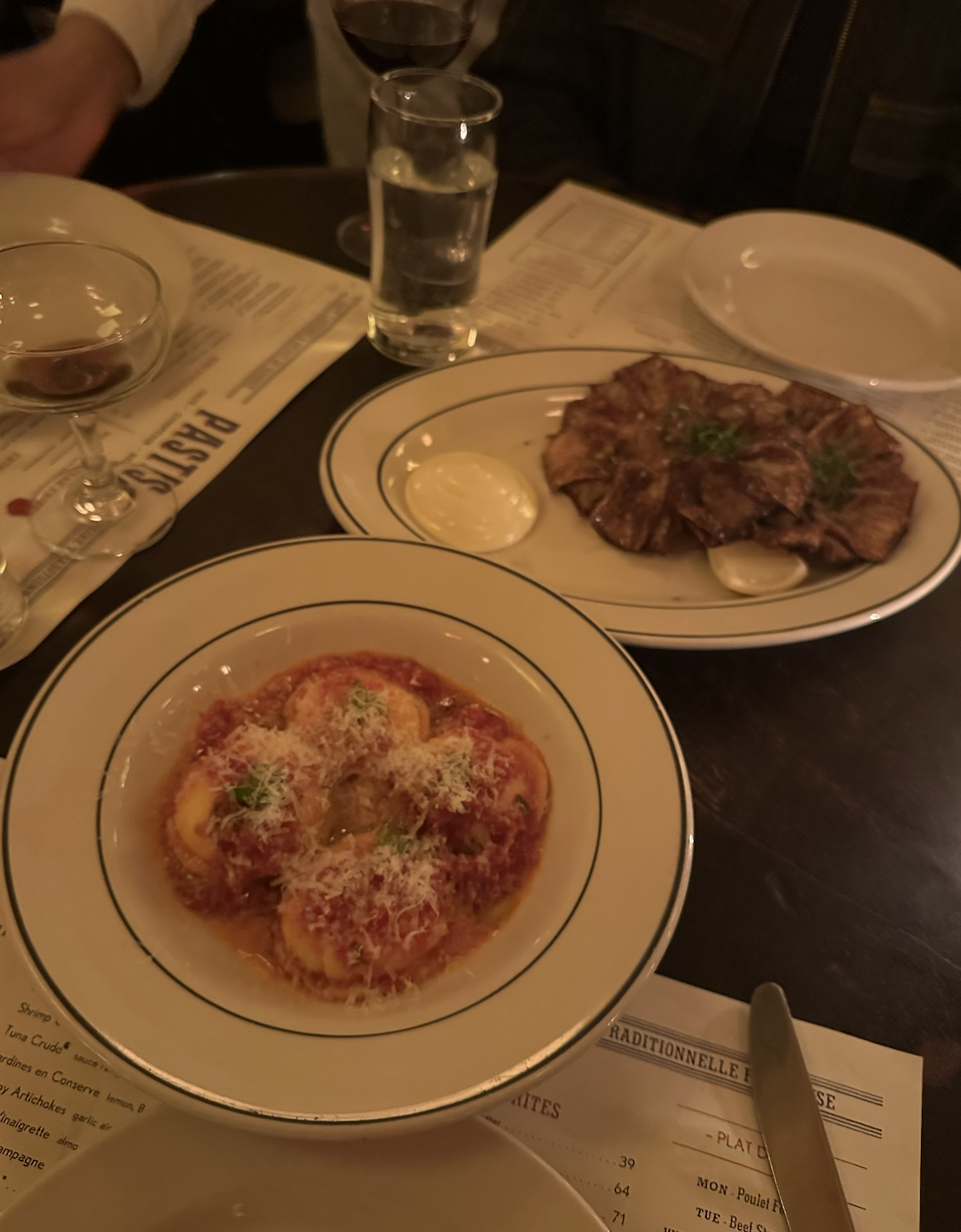 Pastis - Meatpacking District: Pastis is a super cozy French restaurant located in the Meatpacking district of the city. The menu has a range of classic french dishes with a little variety, too. To start, we split oysters which were great. We ordered the Ricotta Ravioli and the Crispy Artichokes next. Both were delicious, but the Crispy Artichokes were a favorite for me. I loved this dish and the sauce they came with. We split the Entrecôte steak with a side of their Pommes Purée. The steak with the mashed potatoes combination was good and the steak was cooked well. An honest highlight from the whole dinner was the service. Our waiter was so friendly and we laughed a lot with him, and I always appreciate that.