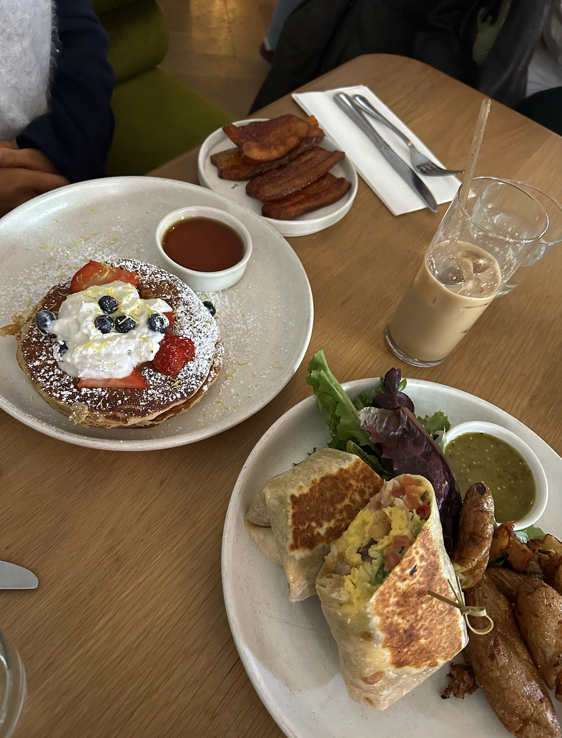 Cafe Maud - East Village: Cafe Maud in East Village is an adorable, small cafe. I really enjoyed the ambiance of the restaurant, the food, and the Maple latte I ordered. I ordered the Breakfast Burrito with chicken sausage which I loved. The burrito comes with a side salad and potatoes which is a huge portion and definitely too much food for me, but if you're looking for a filling breakfast I'd recommend getting that. Overall a great breakfast spot. Like many places in New York it gets very busy in there, so a reservation was definitely much needed.