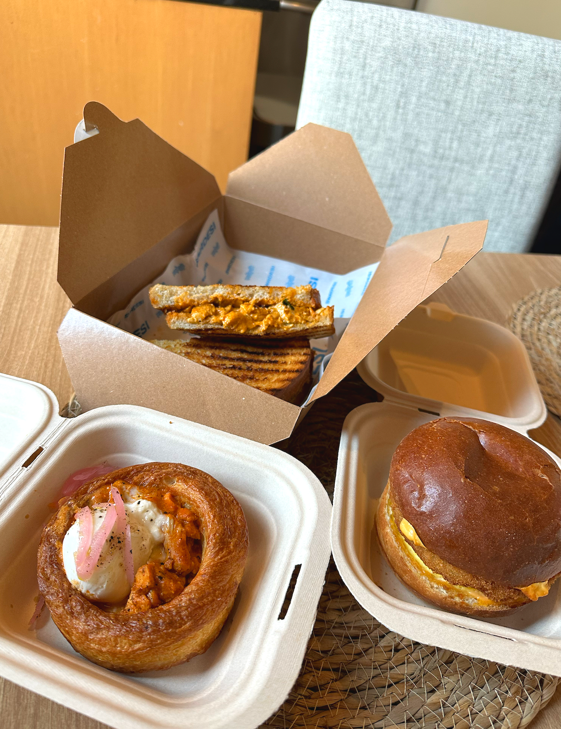 Food - Butter Chicken Croissant, Chicken Tikka Toastie, and Breakfast Sandwich: These savory pastries were absolutely delicious. There were many items on the menu that I wanted to try, but these 3 stood out to me the most and I am very glad we picked them. The Butter Chicken Croissant (left) was flaky and soft, and the burrata with the pickled onions mixed in with the butter chicken gave it a refreshing and balanced bite. The Chicken Tikka Toastie (middle) was so flavorful. The sandwich had a cilantro and mint mayo that gave it that same balanced bite. The Breakfast Sandwich (right) was an elevated classic breakfast sandwich. It came with a crispy potato tikki which was a crispy hashbrown and a spicy garlic mayo. I loved all three of these and I will definitely be going back to pick up pastries from here in the future.